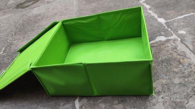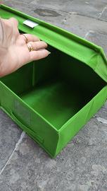 5 scatole (ACQUISTO MINIMO ) per armadi per riporre accessori o abbigliamento, cm 40 x 30 x 20 di altezza, con manico e coperchio attaccato con angoli, smontabili e impilabili: 3 in tinta unita verde mela come da foto, una tutta blu e una blu navy con piccoli disegni bianchi e blu (foto su richiesta)