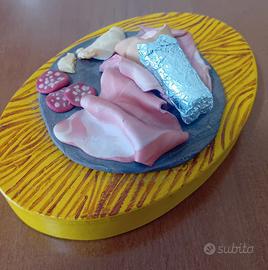 sono due scatolette vendute assieme, di cartone dipinto a mano , con due sculture in pasta polimerica sul coperchio interamente realizzate a mano con lunga lavorazione.