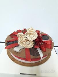 Vendo scatolina decorata circolare diametro 21 cm, con applicazioni rose e nastro rosso. Disponibile 1 pz.