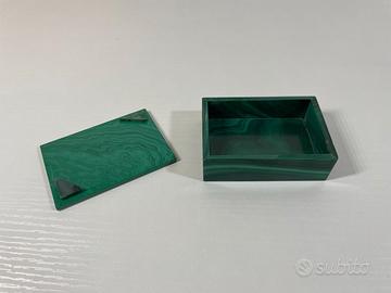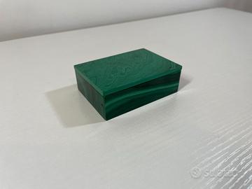 Scatolina portagioie in malachite. Forma rettangolare con coperchio coordinato. Dimensioni: 7.5cm x 5.3cm x 2.5cm. Peso: 180g.