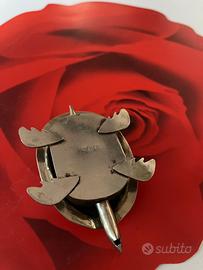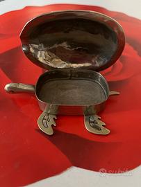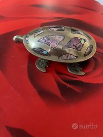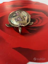 Scatolina a forma di tartaruga in metallo bianco, forse argento e madreperla, cm 10 x 6,5 , provenienza Messico , vintage in ottime condizioni