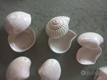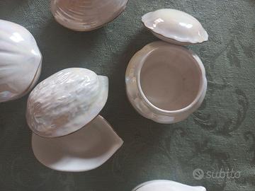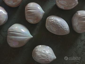 Vendo lotto di n. 17 scatoline in ceramica madreperlate con base e coperchio con profilo dorato. Varie forme tema marino (conchiglie) e frutta secca (noci, mandorle, castagne, nocciole). Adatte anche per bomboniere.