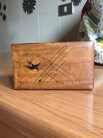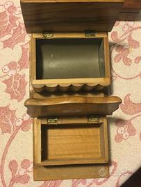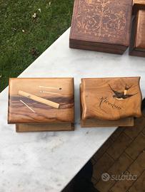 Le scatoline hanno anche la carta abrasiva per accendere i fiammiferi. le dimensioni sono rispettivamente quella con la sigaretta: altezza 5,5cm, base 10,5x9cm . Quella con la rondine: altezza 5cm, 10x8,5 la base. entrambe queste scatolette sono in legno di ulivo e sono in ottime condizioni.