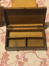le ultime due scatoline di foto 6 sono adatte a contenere piccoli oggetti o anche preziosi come anelli , braccialetti o catenine. Quella di sinistra ha intarsiato un disegno cosiddetto 'floreale' tipico dell'intarsio sorrentino, raffigura una fontana centralmente e 2 uccelli in alto ai lati, intarsiati in legno più chiaro su un fondo di legno più scuro in marrone. dimensioni: altezza 3,5cm, base 11x10cm il legno non è ulivo, forse da albero da frutta. Quella di destra ha un disegno geometrico a 'micromosaico', in legno tinto, frequente nell'intarsio sorrentino, inserito con molta precisione nel riquadro esterno, geomerico e a tasselli più grandi. dimensioni: altezza 3,5cm, base 10x10cm. anche queste scatole si presentano molto bene per l'età che hanno!