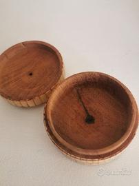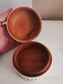 La superficie della scatola è decorata con un motivo a mosaico costituito da segmenti ossei rettangolari disposti verticalmente sui lati, creando un sofisticato effetto visivo.