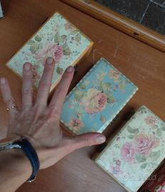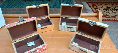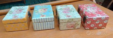 Vendo 4 scatoline fantasia mista, in legno rivestite in carta a fiori e dentro in velour. Nuove, dim. 15x10 circa.