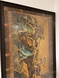 Grande rappresentazione di una scena mitologica, probabilmente ispirata a opere neoclassiche del XIX secolo. Il quadro raffigura una composizione ricca di personaggi in movimento, cavalli rampanti e figure allegoriche, con forti richiami a scene epiche come “Il Trionfo di Bacco” o “Il Ratto di Elena”. I toni caldi del cielo e i drappeggi colorati esaltano il dinamismo e la teatralità dell’opera.