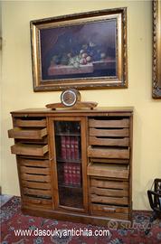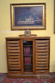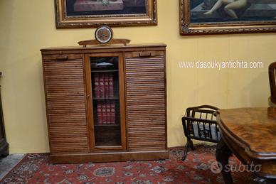 Grande classificatore a tre sezioni stile inglese in rovere , provvisto di doppia serrandina ai due lati , dove all’interno si celano 10 cassetti portadocumenti estraibili , mentre nella parte centrale, troviamo una vetrina con quattro ripiani all’interno. Design raffinato e funzionale, si adatta perfettamente in qualsiasi ambiente classico e moderno aggiungendo un tocco vintage. Dimensioni : Larghezza 130 cm. Profondità 39 cm. Altezza 126 cm. Dimensioni interne della vetrina : Larghezza 41 cm. Profondità 30 cm. Altezza dei ripiani varia da 25 a 29 cm. Dimensioni dei cassetti estraibili delle serrandine : Larghezza 37.5 cm. Profondità 27 cm. Altezza 5 cm. Chi fosse interessato a una visita virtuale della nostra galleria può accedere ai motori di ricerca, inserendo il nominativo " Dasouky antichita' " Per informazioni contattateci ai seguenti numeri Cell. - Cell. EURO 650,00 SPEDIZIONI IN TUTTA EUROPA CON CORRIERE ESPRESSO
