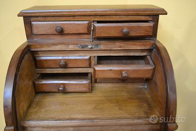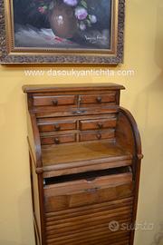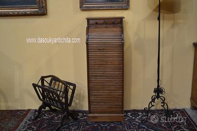 Schedario-classificatore in legno di rovere. stile inglese con chiusura a serrandina dove all’interno si celano sette cassetti, un ripiano di scrittura con quattro cassettini, nel piano superiore a vista altri due cassettini.