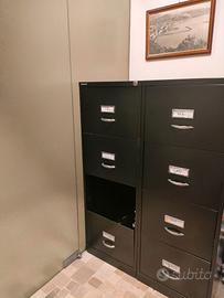 2 schedari in acciaio di colore nero, con alcuni segni di deterioramento dovuti all'uso ma in buono stato di funzionamento. Per uno dei due c'è un cassetto da sistemare (uscito dai binari).