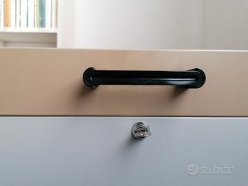 Schedario vintage Buffetti in metallo mod. 0784, con quattro ruote pivottanti. Struttura monoblocco in metallo verniciato grigio con coperchio beige ribaltabile e scorrevole su guide antirumore, serratura con una chiave presente e funzionante. Ripiano portaoggetti nella parte inferiore. Ottime condizioni. Misure 55x50 h 79. Solo ritiro a mano zona Vittorio Veneto.
