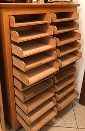 Vendo schedario vintage anni 50/60 in legno (alto 140 cm largo 100 cm profondo 45 cm), molto solido e ben tenuto. Le serrandine, con chiavi, scorrono bene e all'interno ci sono 20 cassetti in legno perfetti per organizzare documenti, cartelline o materiale da ufficio.