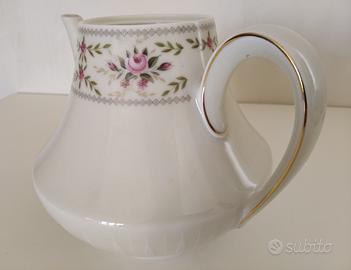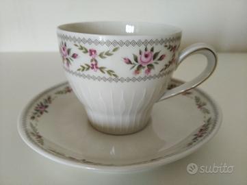 "Scherzer Bavaria Germany" servizio da tè, anni '60. Porcellana, decoro floreale e geometrico con dettagli dorati. Composizione da 9 persone completa, tazze, piattini, teiera e zuccheriera. In condizioni impeccabili, senza segni di usura nè opacità.