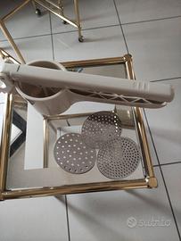 Schiaccia patate " GHIDINI " completo di n. 3 dischi cambiabili. Colore bianco Misure: cm. 36 x 8,7 x 10,3