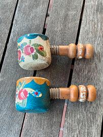 Delizioso schiaccianoci ( Nussknacker ) in legno, artigianato tirolese, finalmente dipinto. Dalla forma rotonda dal particolare manico schiaccianoci all’interno di un contenitore per frutta secca. Dotato di due schiaccianoci a vite in legno decorato