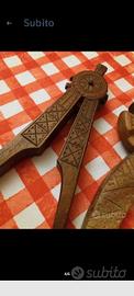 Si tratta di utensili da cucina a leva, caratterizzati da ricchi decori geometrici e motivi a rosetta realizzati a intaglio. In particolare, l'esemplare a destra presenta una forma a testa di uccello o di animale stilizzato, un design molto diffuso tra gli anni '50 e '70.