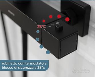 Miscelatore termostatico con blocco di sicurezza a 38 gradi contro le scottature.