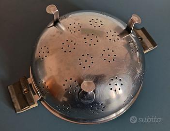 Scolapasta in acciaio inox. Diametro 23 cm. Altezza 11 cm. In buone condizioni complessive.