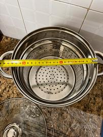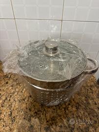 Nuovo set composto da scolapasta in acciaio inox e coperchio suo sempre acciaio inox e vetro temperato svendo tutto