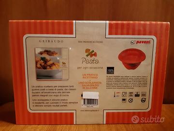 Scolapasta in silicone + ricettario per piatti a base di pasta, ancora confezionato.