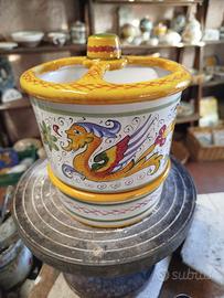 scolaposate in ceramica dipinto a mano in stile Ricco Deruta, composto di due pezzi separabili, pratico e resistente.