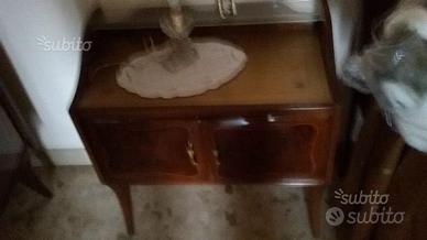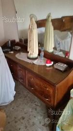 camera matrimoniale VINTAGE 1955 MOGANO in Buone condizioni ,COMPOSTA da ; LETTO,ARMADIO con SPECCHIO ROTTO,CASSETTONE,2 COMO',+SPECCHIERA [ a corredo 2 poltroncine vintage + copriletto.. ( RASO stesso colore POLTONCINE) ]