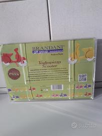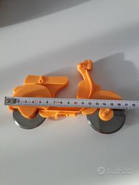 Simpatico taglia pizza a forma di scooter, con due lame rotonde. Corpo di plastica dura. Nuovo mai usato.