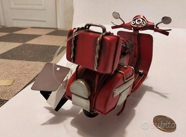 Scooter tipo Vespa in metallo riciclato, da collezione, non è un giocattolo. Disponibile anche giallo. L'euro è stato fotografato per potersi regolare sulla grandezza dell'oggetto . cm 17 x 11