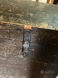 baule antico il legno com cerniere molto capiente e puó essere un ottimo oggetto di arredamento l’usura sul legno nel tempo si vede ma il bello é proprio vedere le venature naturali lasciate dal legno
