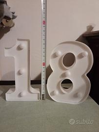 Scritta per 18esimi o arredamento casa numero 18 illuminata a batteria, in foto il numero uno ha le batterie più scariche. per questo la luce è più fiacca.