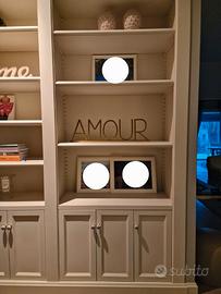 Vendo scritta decorativa “AMOUR” in metallo color oro/ottone, perfetta come complemento d’arredo per libreria, mensola, credenza o parete attrezzata.
