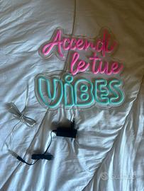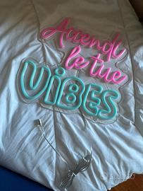 Vendo lampada decorativa LED stile neon con scritta “Accendi le tue VIBES”, realizzata in silicone flessibile su base in acrilico trasparente. Design moderno con luci rosa e azzurre, ideale per arredamento e ambienti creativi. Alimentazione tramite cavo con connettore DC (barrel). Prodotto nuovo, mai utilizzato.