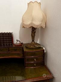 Scrittoio stile ‘900 inglese in noce massello con panelli e profili in vera pelle di colore verde anticato con bordature stampate in oro e bronzi alla gambe. Costituita da una base con un cassetto centrale e piano di scrittura protetto da piano di cristallo e da una alzatina con 3 cassetti lato sinistro una parte finta cassetti a destra con vano interno con apertura a compasso e tre minicassetti centrali. Completano il set uno sgabello in noce con imbottitura in pelle con borchie in ottone e cestino portacarte cilindrico in pelle e cuoio con inserti in paglia di vienna. La lampada cariatide con base coordinata è venduta a parte. Pezzo unico realizzato artigianalmente, prezzo poco trattabile per appassionati.