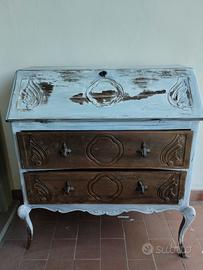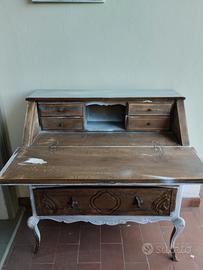 Scrittoio a ribalta da restaurare, uno dei due cassetti non scorre bene. Abbinata ad una sedia. Prezzo trattabile. Larghezza 90cm Profondità 40cm Altezza 97cm