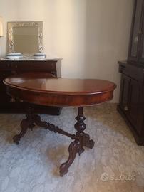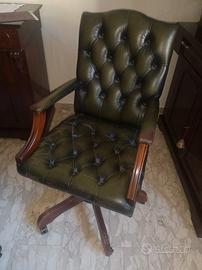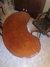 Elegante scrittoio inglese in mogano con caratteristica forma a fagiolo con gambe tornite ed intagliate, con certificato di autenticità e provenienza. Epoca metà 800. Dimensioni 121x61x76. Accompagnato da poltrona reclinabile capitonne' in pelle scura.