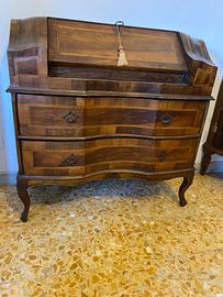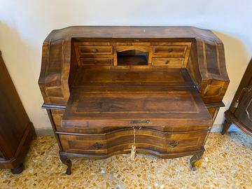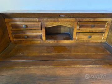 Splendido scrittoio antico, realizzato in legno di noce. Si presenta in ottime condizioni, con dettagli intarsiati. - Modello ribalta con vani e cassetti. - Linee eleganti e curve morbide. - Finiture di pregio.