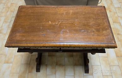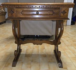 Scrittoio di inizi '900 in stile rinascimentale. Mobile di famiglia ereditato, manifattura italiana. Patina naturale, necessaria pulizia più accurata e solo manutenzione conservativa; presenti segni d'usura ma si presenta oggettivamente in stato molto buono. Gambe a lyra sagomate, ricco apparato decorativo, ideale come scrivania, ingresso o consolle. Misure 68x32cm.