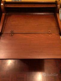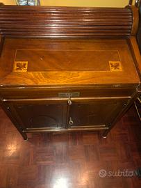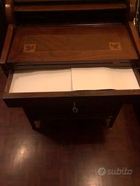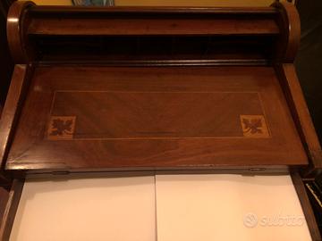 Scrittoio in legno arte povera con intarsi nella parte superiore. Misure: H 85cm (nel punto stondato più alto) L 64cm P 43cm