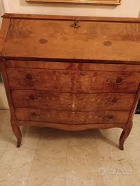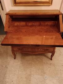Scrittoio con ribalta in stile classico, in noce con eleganti cornici intarsiate e disegni sempre intarsiati che richiamano la vite e le piante.