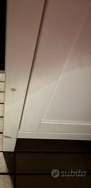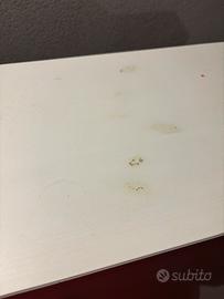 Scrittoio con ribaltina Ikea Hemnes in legno bianco, dimensioni base 89 × 43 cm, tavolino aperto profondità totale 77 cm, altezza 108 cm in buone condizioni. Qualche segno d’usura sulla pittura, come da foto.