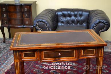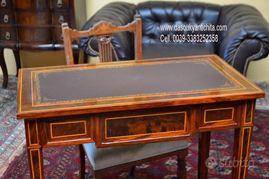 Scrittoio-console in Stile Luigi XVI con cassetto , in noce lastronato radica di noce e filettature in acero, gambe troncopiramidali, piano in ecopelle marrone .