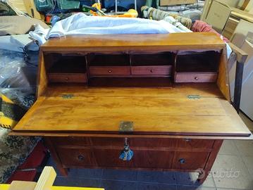 mobile che si compone di una parte superiore con lo scrittoio con piccoli vani e piccoli cassetti e di una parte inferiore con due grandi cassetti .