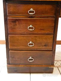 Scrittoio da centro arte povera in legno di frassino massello composto da quattro cassetti con maniglie cromate nel lato sinistro e due gambe tornite nella parte destra. Ogni cassetto è firmato: “adb DE BAGGIS CANTU'” 1970/80. Nel 1929 Angelo De Baggis, uno dei principali fondatori del Salone del Mobile di Milano nel 1961, nonché presidente per oltre 20 anni della manifestazione, fonda a Cantù il primo stabilimento dell'omonimo marchio, grande nome dell’artigianato made in Italy non più attivo, ha cessato la sua attività nel 2008. Mobile da collezione canturino presente nel mercato vintage con la sua firma, spesso legata alle collaborazioni con grandi maestri durante la metà del 900, da Ico Parisi a Gio Ponti. Proprio Ponti, nel 1946 scriveva sulla rivista Stile, in merito alle ditte canturine che più amava, che «il lavoro di queste plaghe artigiane che hanno una tradizione di grande qualità esecutiva va rispettato e risolto in pezzi per l’esportazione». Misura: altezza 77 x 122 x 55 cm.