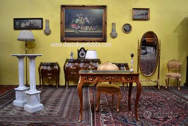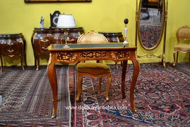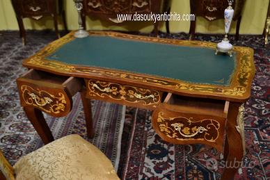 Scrittoio da centro in stile Luigi XV , dalle dimensioni contenute e armoniose in noce massello , finemente lastronato e intarsiato in legni da frutto a motivi floreali, piano superiore sagomato e centrato da un inserto in ecopelle verde , decorato lungo i bordi in foglia oro impressa a caldo, fascia frontale provvista di tre cassetti due laterali più piccoli e uno centrale di dimensioni maggiori, gambe cabriole impreziosite da applicazioni in bronzo cesellato e dorato che ritroviamo anche sulle maniglie dei cassetti Dimensioni : Larghezza 97.5 cm. Profondità 51.5 cm. Altezza 75 cm. Chi fosse interessato a una visita virtuale della nostra galleria può accedere ai motori di ricerca, inserendo il nominativo " Dasouky antichita' " Per informazioni contattateci ai seguenti numeri Cell. Cell. EURO 350,00 SPEDIZIONE GRATUITA IN TUTTA ITALIA CON CORRIERE ESPRESSO