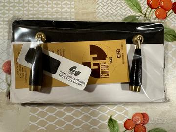 Vendesi servizio per scrittoio da scrivania nuovo ed ancora imballato in vera pelle di alta qualità di colore nero di marca TEMPORA composto da 5 accessori: sottomano grande doppio 50x36cm; Portapenne 2 posti; Apri busta in metallo, Sparticarte; Base portanotes con scomparti.
