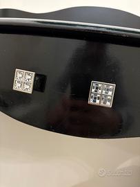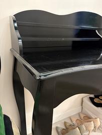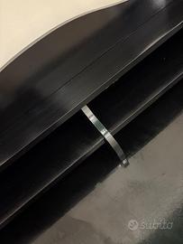 Vendo elegante consolle scrittoio in legno laccata nera, con pomelli in cristallo Swarovski, sono presenti delle nicchie nella parte superiore e un cassetto centrale, il mobile è di ottima qualità, comprato in un negozio rinomato della mia città, quindi non finto legno, cartone rivestito, ecc Largo 120, profondo 43, alto davanti 75, dietro 92 Sono presenti imperfezioni, sbeccature e graffi,