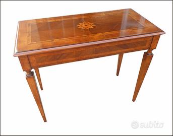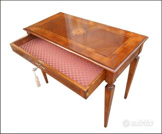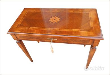 Questo scrittoio intarsiato e lastronato a mano è un vero capolavoro di artigianato. La sua struttura in legno massello è stata sapientemente lavorata per creare un design elegante e senza tempo. Il piano superiore, impreziosito da un raffinato intarsio, offre un'ampia superficie di lavoro mentre il cassetto inferiore consente di tenere a portata di mano gli oggetti più importanti. Le linee sinuose e i dettagli decorativi in stile classico rendono questo mobile un pezzo da collezione, perfetto per arredare con stile e raffinatezza uno studio o un ufficio. Le dimensioni generose e la solidità della costruzione lo rendono un investimento duraturo nel tempo. Un tocco di eleganza senza tempo per un ambiente di lavoro accogliente e raffinato.