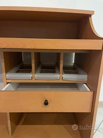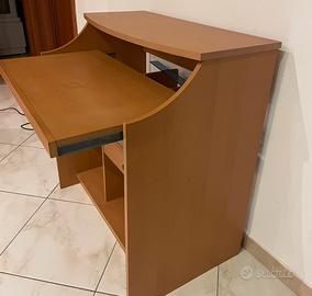È uno scrittoio/porta computer con vano porta CD nella parte inferiore e un cassetto. Nel complesso è in buone condizioni e non presenta ammaccature. Il colore è nocciola chiaro. 80x35 (base sopra) x 41,5 (base sotto) x 70 (altezza) Zona Numidio Quadrato. Non accettiamo spedizioni, poiché risulta difficile per noi da trasportare.