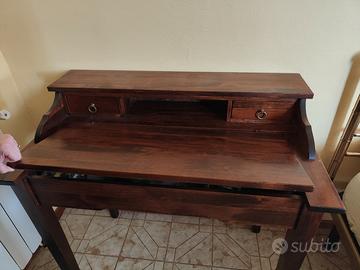Scrittoio in arte povera, color noce con 2 cassetti e grande vano contenitore. Misure: 100x60cm circa