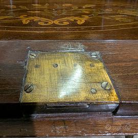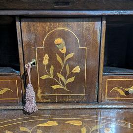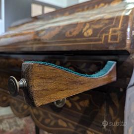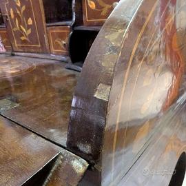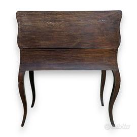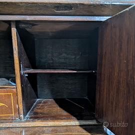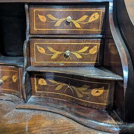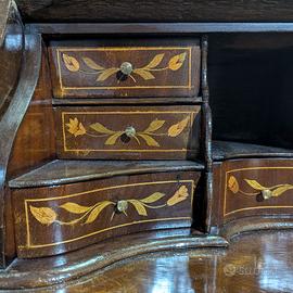 Struttura elegante su quattro gambe cabriole curve e sinuose, piano ribaltabile con chiusura a piastra in ottone dorato, cassetto frontale e serie di cassettini e secretaire interni.